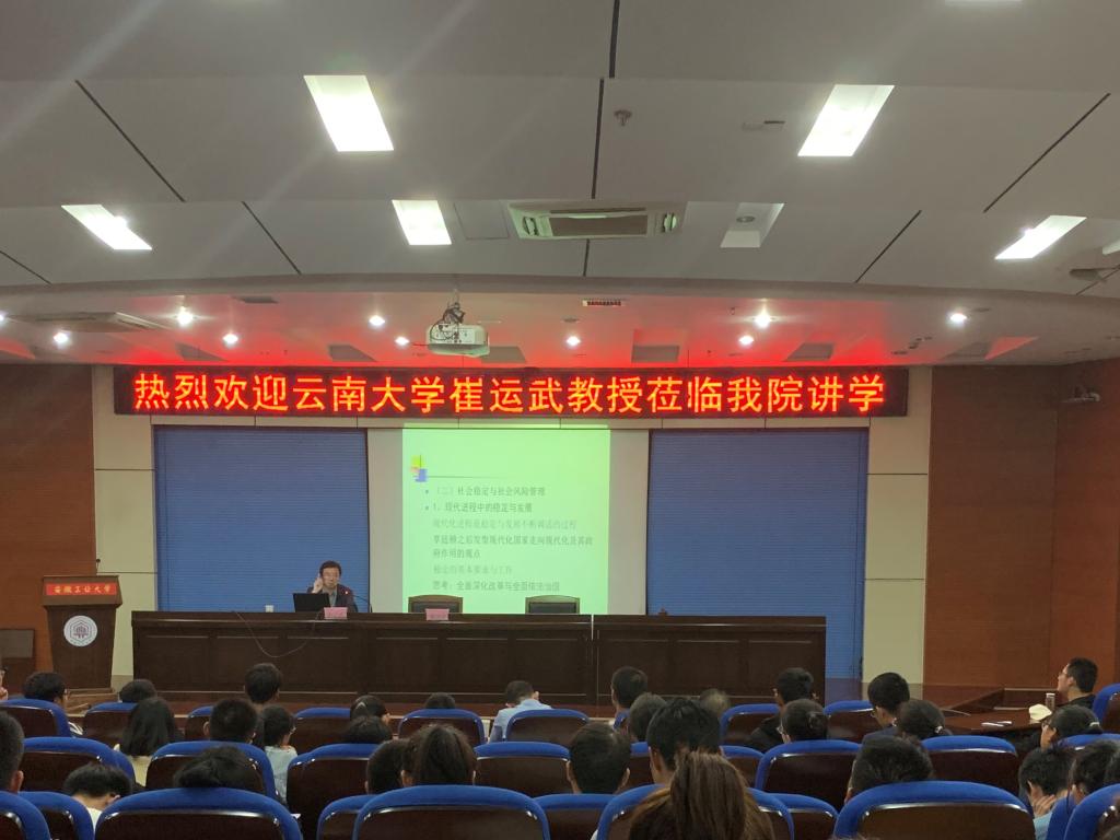 崔运武教授在秀山校区第一学术报告厅做了“社会风险管理的若干问题”的学术报告,报告会由hy3380cc海洋之神经理徐济益主持,学院师生180余人聆听了本次报告。崔运武教授从社会风险管理与中国改革导入,结合近年来的研究成果,并运用多个案例,就社会风险管理的主要领域、管理体制与能力,以及我国社会风险评估及相关问题进行深刻阐释。整场报告会内容充实、气氛热烈,就师生感兴趣的问题,崔教授做了细致地回答。