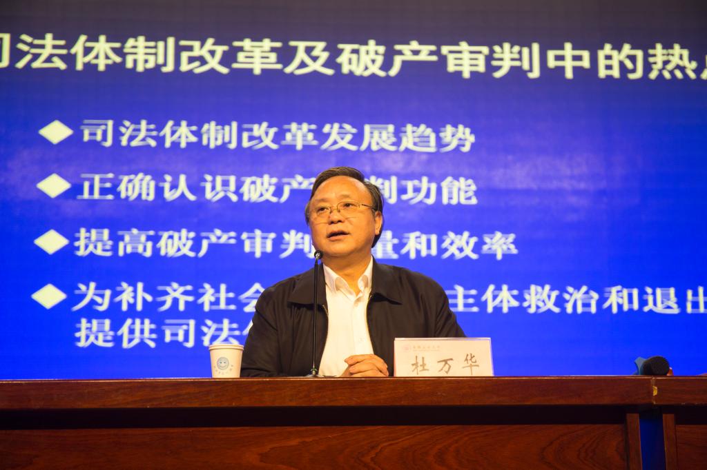 11月9日上午,最高人民法院咨询委员会副主任、中国法官协会副会长、最高人民法院民法典编纂工作研究小组副组长杜万华大法官应邀在公司秀山校区老员工活动中心做“司法体制改革及破产审判中的热点问题”学术讲座。公司党委书记刘新跃,副董事长祖明,公司党政班子成员、马鞍山市法院、检察院等单位人员及全体专业教师和研究生、部分本科生代表参加了学术报告会。公司党委书记刘新跃教授主持本次活动。