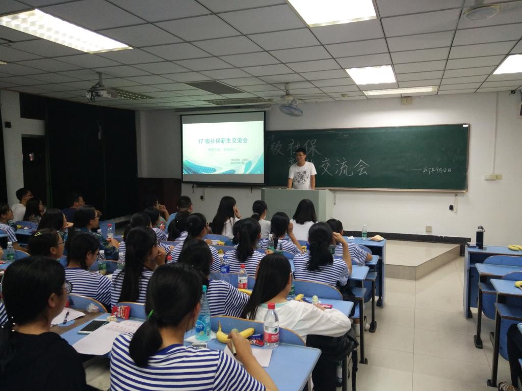 9月12日晚,2017级劳动与社会保障专业新生交流会在佳山校区教三北306举行。交流会分为四个环节:第一环节是杨哲老师发言,第二环节是新生自我介绍,第三环节是2016级社保同学分享自己的大一学习生活心得,第四环节是新生提问,2016级同学进行解答。