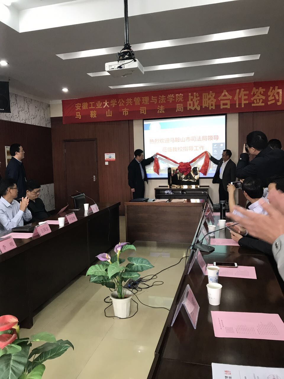 按照会议流程,hy3380cc海洋之神公法学院与马鞍山市司法局签署了战略合作协议书,同时举行了聘任马鞍山市司法局局长侯沪东为兼职教授和教学实践基地揭牌仪式。揭牌仪式后,司法局各部门领导与公司党政领导及各系主任就人才培养模式、局院合作路径、未来工作计划等方面进行深入而热烈的交流讨论,双方在多个方面取得了进一步共识。